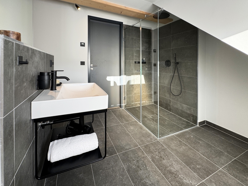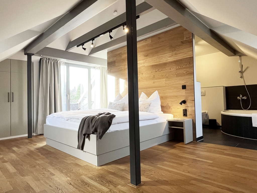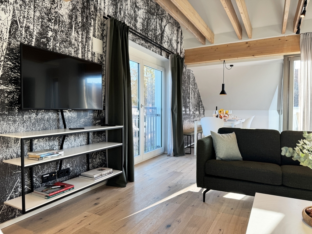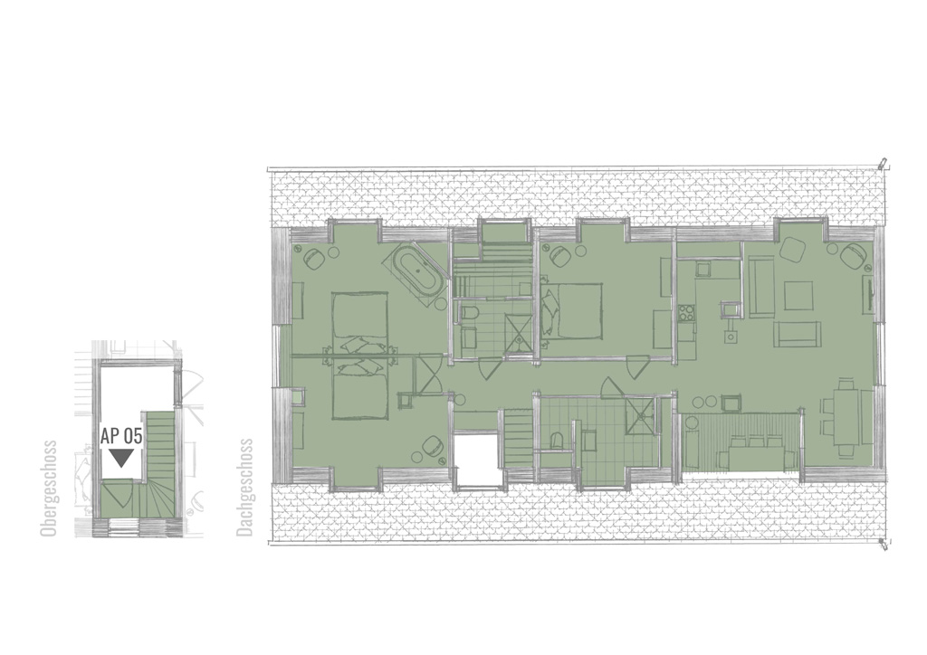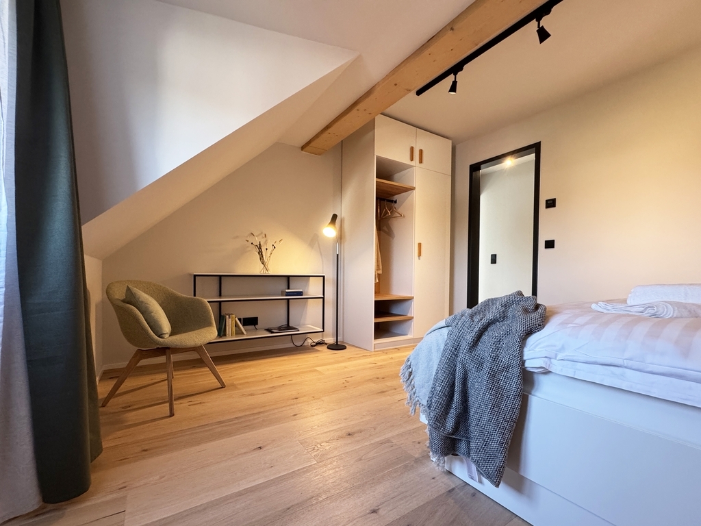 120m² | Dachwohnung | Wohn-/Koch-/Essbereich | 2 Schlafzimmer | 1 Schlafzimmer mit Badewanne | 1 Zustellbett im Wohnbereich | 2 Bäder mit Dusche und WC | Dachloggia | Sauna | Kaminofen
