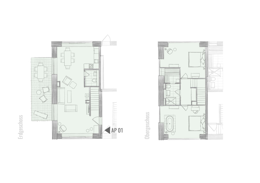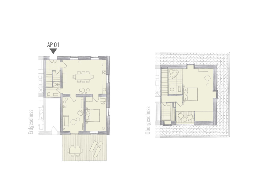 105m² | Maisonette | Koch-/Essbereich | 1 Wohnzimmer | 1 Schlafzimmer | 1 Schlafzimmer mit Badewanne | 1 Zustellbett im Wohnzimmer | 1 Bad mit Dusche und WC | 1 sep. WC | Terrasse | Sauna | Kaminofen
