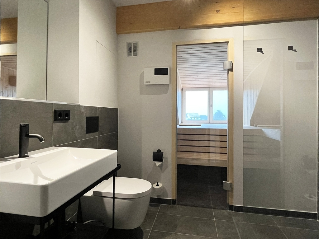 105m² | Maisonette | Wohn-/Koch-/Essbereich | 1 Schlafzimmer | 1 Schlafzimmer mit Badewanne | 1 Zustellbett im Schlafzimmer (DG) | 2 Bäder mit Dusche und WC | Terrasse | Dachloggia | Sauna | Kaminofen
